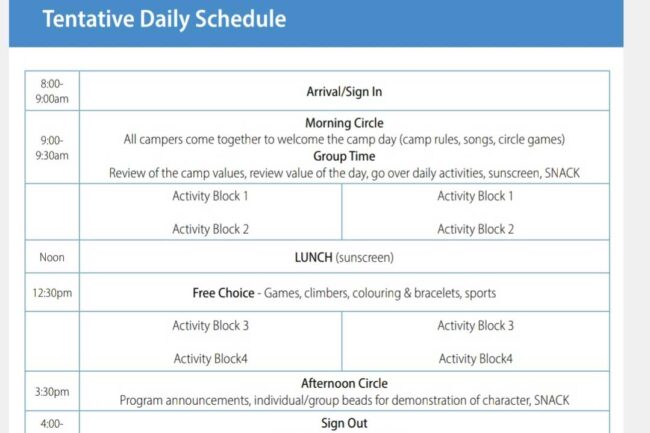 Summer Camp Daily Schedule
